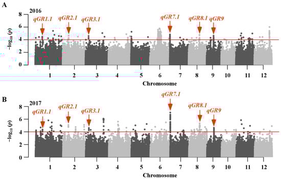 GWAS of seed germination in Japonica rice. Manhattan plots for germination rate at three days after imbibition in 2016 (A) and 2017 (B). The horizontal red lines represent a statistical significance threshold of −log10 p = 4. The red arrows indicate that six stable loci were identified across two years.