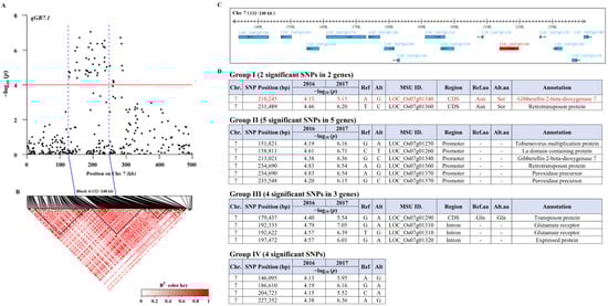 Identification of candidate gene for qGR7.1. (A) Regional Manhattan plot surrounding the peak on chromosome 7 (0–500 kb); (B) LD heatmap for qGR7.1; (C) Fifteen annotated genes within the LD block (132–240 kb) of qGR7.1; (D) Fifteen common significant SNPs across two years within the LD block of qGR7.1 were divided into four functional groups. As a measure of LD, the color intensity of the box on the LD plot corresponds with the extent of R2 according to the legend. From an LD analysis, 11 blocks (inverted black triangles) were identified on qGR7.1. The lead SNP was located within an approximately 108-kb block (Block 4: 132,222 to 240,062 bp). The rectangles show the position of 15 annotated genes within the LD block (132–240 kb) of qGR7.1. The black arrow direction represents the orientation of transcription. The red rectangle indicates the causal gene (LOC_Os07g01340; OsGA2ox5) of qGR7.1. The non-synonymous SNP (Chr7-218,245) shown in red was located in the coding region of OsGA2ox5.