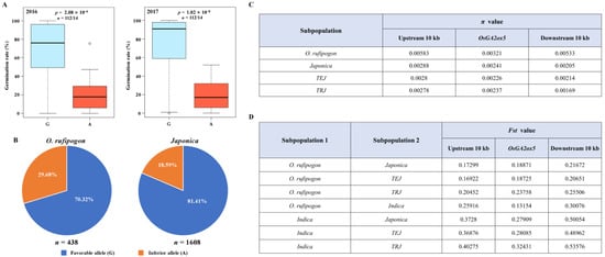 As mentioned above, one non-synonymous SNP (Chr7-218,245) in OsGA2ox5 was significantly associated with germination rate in both years (Figure 3D), and we therefore further analyzed the effect of this key SNP on seed germination. The two allelic groups separated based on the base type of this SNP displayed statistically significant differences in seed germination across two years, with the G-type showing higher germination rate than the A-type (Figure 5A), suggesting that the G-type was potentially a favorable allele of OsGA2ox5 for improving rice seed vigor. To characterize the distribution of A-type and G-type in rice subpopulations, the SNP details were retrieved from the RiceVarMap database and the ECOGEMS database. We found a higher proportion of the allelic frequency of the G-type in Japonica (81.41%) accessions than in O. rufipogon (70.32%) (Figure 5B). These data suggested that the favorable allele of OsGA2ox5 gene was likely selected during rice improvement. To confirm this, average nucleotide diversity was estimated in OsGA2ox5 gene and its flanking regions (10 kb) based on sequencing data reported previously [,]. Compared with O. rufipogon, average π value in the genomic region harboring OsGA2ox5 locus was significantly reduced in Japonica, TEJ and TRJ (Figure 5C), suggesting that OsGA2ox5 has undergone selection during rice improvement. We also calculated population differentiation statistics for OsGA2ox5 and its flanking regions (10 kb) between different subpopulations. The results showed that pairwise measurements of Fst ranged from 0.13 to 0.54 in the region surrounding OsGA2ox5 (Figure 5D). Among them, the Fst values between Indica and Japonica were more than 0.25. Therefore, we propose that very strong genetic divergence in the OsGA2ox5 region might exist between Indica and Japonica.