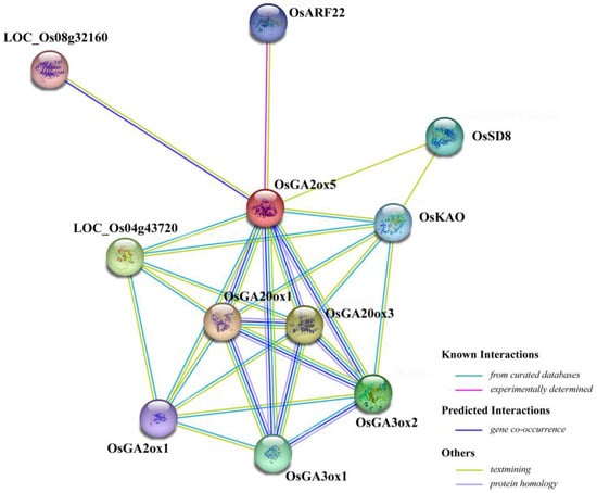 Schematic prediction of the proteins that might interact with OsGA2ox5. Colored lines drawn between OsGA2ox5 and other proteins indicate protein interactions, which were identified through bioinformatics and experimental methods, including known interactions, predicted interactions, textmining and protein homology. The color key in the connecting lines is shown to the bottom-right corner of the figure.