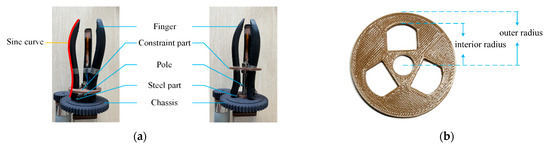 The design of gripper is shown in Figure 2. Three fingers were in each of the three holes of the constraint part. The fingers were fixed to the chassis by the “L-shaped” steel parts. The steel parts can produce elastic deformation. The fingers close when the constraint part advances. When the constraint part retreats, the fingers gradually recover to their initial positions. Due to the sine curve is smooth, continuous, and differentiable, the constraint part moves smoothly in contact with the fingers. On the one hand, it is intended to transform the finger opening and closing into the constraint behavior, which realizes the stable movement and precise control of the fingers. On the other hand, the problems of grasping caused by rotational speed, torque, and precision of joint motor are avoided, to a certain extent.