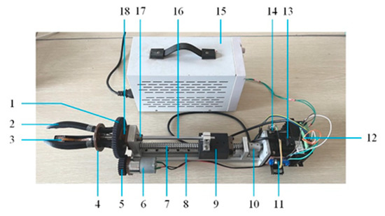 The design of end-effector for small spherical fruit picking. Note: 1, Chassis; 2, Finger; 3, Pressure sensors; 4, Constraint Part; 5, Gear; 6, DC Motor; 7, Screw; 8, Slide track; 9, Slider; 10, Coupling; 11, DC motor drivers; 12, Stepper motor driver; 13, Stepper motor; 14, Arduino control panel; 15, Power; 16, Pole; 17, Linear bearings; 18, Change the channel.