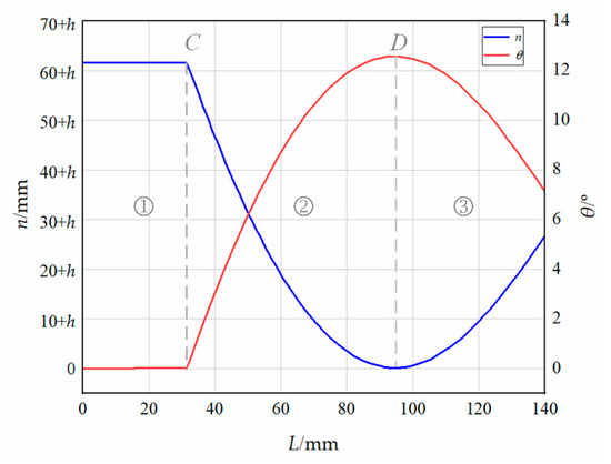 The relationship between L and θ and n. Note: C and D are the two points through which the constraint part moves from chassis to finger ends. ①, ② and ③ are three stages divided by the changes in n and θ.