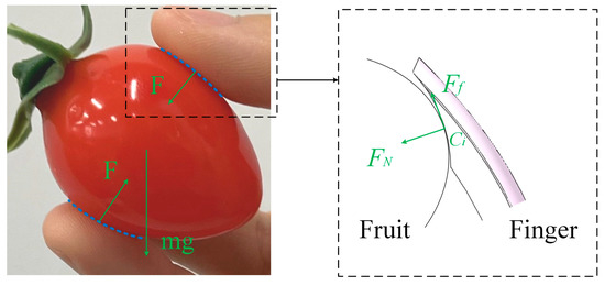 The gripper is rotated synchronously with the fruit to separate the fruits from the stalk. During this period, the fingers contact the target fruit, and the two objects do not allow to slide against each other to achieve stable grasping. Thus, the whole system [27,28] is in equilibrium. The following relationships of mechanical and dynamic need to be satisfied: