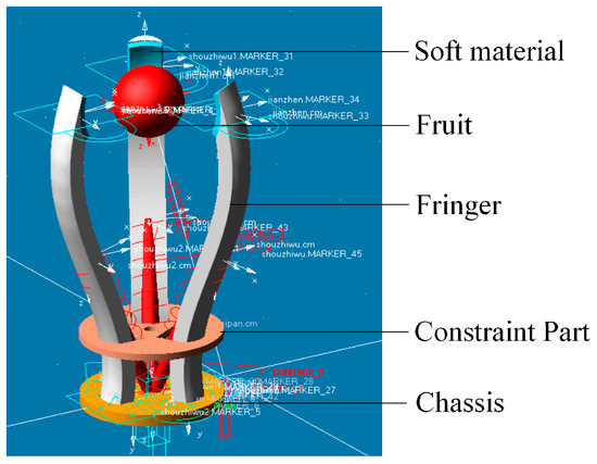 ADMAS 2018 software was used to carry out an analysis of motion simulation, exploring the movement characteristics of the gripper. It would provide the theoretical basis for realizing fast and undamaged control algorithms. The end-effector clamping principle is that constrain part controls the opening and closing of three fingers. In the simulation, only the relevant parts of the gripper were studied. Cherry tomatoes are non-standard spheres. So, the ball was used instead of actual fruit in the simulation model. The physical properties of cherry tomatoes were taken as the parameters of the ball. The fruit-holding process was idealized in simulation (Figure 8).
