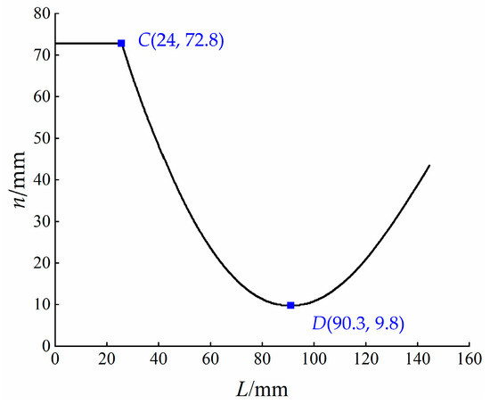 Figure 5 was inferred from Equations (5) and (6). With the increase in L, θ and n changed synchronously, and showed a negative correlation. As the constrain part advanced, the finger’s movement could be divided into three stages. Stage one was the constraint part did not touch the finger, and θ and n did not change. Stage two was a gripper closing stage. As the constraint part advanced to the LC, it touched the finger and caused it to start closing. Then, L increased, θ increased, and n decreased. When the constraint reaches LD, θ and n reached the maximum and minimum, respectively. Stage three was gripper opening stage. As the constraint part pass through LD, θ decreased and n increased.
