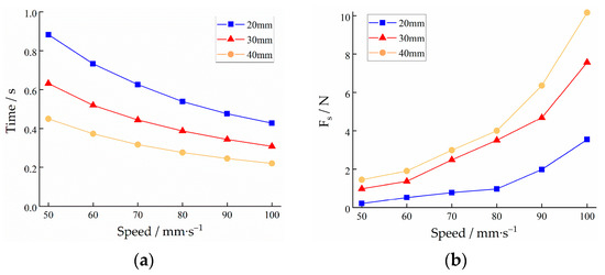 At the same speed, the holding time increased with the decrease in fruit size. Due to gripping small-size fruit, the moving distance of constraint part was long. Under the same fruit size, the larger the speed of constraint part was, the shorter the holding time was. The holding time of three kinds of cherry tomatoes was less than 1 s, which reached the expected target. At the same speed, increased with fruit sizes. The minimum values of were 0.2074 N, 0.9792 N, and 1.4509 N at the speed of 50 mm/s, respectively. At the same fruit size, increased with the speed of the constraint part. When the constraint part speed was 0.1 m/s, reached 10.1627 N [22,29] with 40 mm, which produced a risk of damaging the cherry tomatoes.