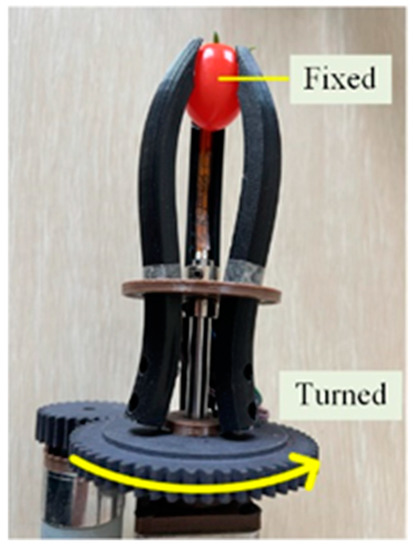 The end-effector designed in this paper was used to harvest small spherical fruits. The picking strategy of “Holding-Rotation” was used to realize picking. It was mounted on a picking robot based on binocular stereo vision. The picking robot guided the end-effector to aim at the fruit employing binocular vision. The gripper closed, grabbed the fruit, then rotated with the fruit to separate the fruit from the stalk (Figure 3).