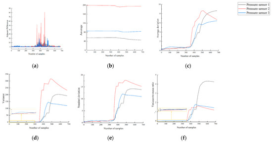 Statistical analysis of pressure sensor output: (a) Adjacent difference; (b) Average; (c) Average deviation; (d) Variance; (e) Standard deviation; (f) Variance-to-mean ratio.