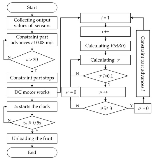 When γ occurs times, it is judged to have produced slip. Let the forward distance of the constraint part be l when slip occurs. Based on multi-group clamping test, when = 30, γ = 0.1, = 3, = 0.5 s, and l = 0.5 mm, it had a better judging and gripping effect. Therefore, according to the two-index judgment, the grabbing index and the slide index , the control algorithm of the two-stage and two-index was designed for fast, stable, and undamaged harvesting of small fruits. The flow chart of control algorithm is shown in Figure 14.