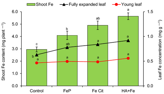 - Fernández, V.; Winkelmann, G.; Ebert, G. Iron supply to tobacco plants through foliar application of iron citrate and ferric dimerum acid. Physiol. Plant. 2004, 122, 380–385. [Google Scholar] [CrossRef]