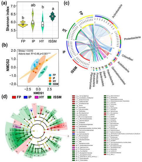 Bacterial community profiles in soil under four farmland management systems: FP: farmer practice; IP: improved farmer practice; HY: high-yield system; ISSM: integrated soil–crop system management. (a) Bacterial alpha-diversity (Shannon), (b) nonmetric multidimensional scaling (NMDS) analysis of bacterial community structure based on Bray−Curtis distance, (c) relative abundances of bacterial taxa at the phylum level, (d) the linear discriminant analysis effect size (LEfSe) analysis showed the significantly different taxa of bacterial communities. Letters represent significant differences (p < 0.05) among four farmland management systems. Error bars indicate standard errors of the mean (n = 4).