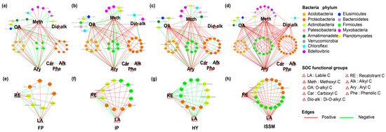Network analysis revealing the associations between bacterial taxa and labile (a–d) and recalcitrant (e–h) SOC functional groups. The co-occurrence network was constructed at the genus level and colored according to the phylum classification. Seven functional groups of SOC functional groups are indicated with red triangles. Red and green lines represent strong linear connections (r > 0.6), respectively. FP: farmer practice; IP: improved farmer practice; HY: high-yield system; ISSM: integrated soil–crop system management. Labile C groups: Methoxyl C, O-alkyl C, Di-O-alkyl C, Carboxyl C. Recalcitrant C groups: Alkyl C, Aryl C, Phenolic C.