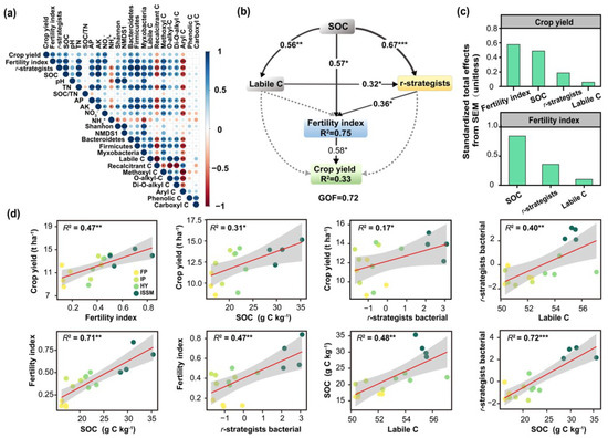 The relative abundance of Bacteroidetes, Firmicutes, and Myxobacteria were linked to soil fertility and labile C (Methoxyl C, O-alkyl C, and Di-O-alkyl C), which were positively correlated with SOC (p < 0.05; Figure 6a). PLS-PM analysis showed that crop yield was directly dependent on soil fertility (path coefficient = 0.58; Figure 6b), which was also supported by the Pearson correlations (Figure 6d). The SOC showed the largest effect on fertility via direct (path coefficient = 0.57) and indirect effects (path coefficient = 0.28) on the relative abundance of r-strategists and labile C pools (Figure 6c and Figure S2). Soil fertility and r-strategists increased with SOC and labile C content (Figure 6c). There were corresponding strong positive correlations between the relative abundances of r-strategist bacteria and the labile C groups (p < 0.05; Figure 6d and Figure S3). The effects of labile C and r-strategists on crop yield were indirect rather than direct (Figure 6b,c and Figure S2). Specifically, crop yield increases were directly dependent on soil fertility. The relative abundance of r-strategists, SOC, and soil fertility positively correlated with crop yield (p < 0.05; Figure 6d). The SOC, labile C, and r-strategists accounted for 75% of the soil fertility index, and the soil fertility index explained 33% of the variance in total crop yield (Figure 6b).
