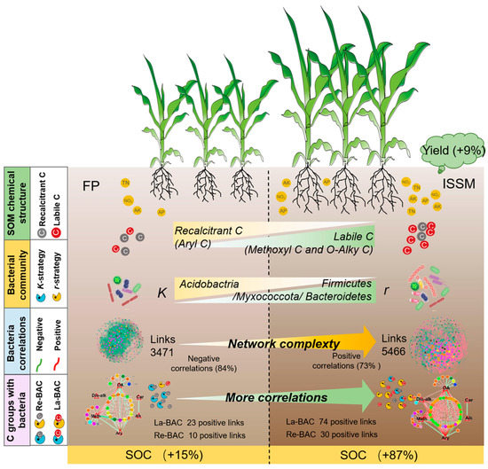 Co-occurrence network analysis provided evidence of the correlation between SOC chemical functional groups and bacterial community composition (Figure 5). The network pattern indicated that the correlation between labile C (O-alkyl C, Methoxyl C, and Di-O-alkyl C) and bacterial genera was 1.4 times higher under ISSM than under FP. In particular, positive correlations increased by 34% and negative correlations decreased by 55% (Figure 5a,d; Tables S6 and S7). Notably, labile C and Aryl C were positively correlated with Firmicutes (Clostridia and Bacilli) in ISSM and FP (p < 0.05; Figure 5, Table S7). Additionally, Paeniclostridium, Romboutsia (Clostridia), Psychrobacillus, and Solibacillus (Bacilli), positively correlated with labile C (O-alkyl C, Methoxyl C, and Di-O-alkyl C), were stronger in ISSM than in other systems (p < 0.05; Figure 5d, Table S2). The relative abundances of Fluviicola (Bacteroidetes) and Anaeromyxobacter (Myxobecteria) were positively correlated with Methoxyl C, and the relative abundance of Haliangium (Myxobecteria) was negatively correlated with Aryl C (p < 0.05; Figure 5d, Table S2).