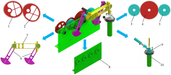 The structural diagram for the well-cellar cavitating mechanism is shown in Figure 1. The mechanism was mainly composed of the non-circular gear mechanism, the spur gear mechanism, the parallel four-bar mechanism, the cavitator, and the frame. One and two were the non-circular gear which constituted the non-circular gear mechanism. Three, four, and five were the straight tooth cylindrical gear which composed the spur gear mechanism. Six, seven, and eight were the double crank, frame, and linkage which composed the parallel four-bar mechanism. Nine and ten were the powershuttle mechanism and cavitator which composed the cavitating device.