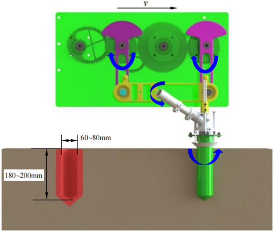 The working principle of the cavitating mechanism is shown in Figure 2. During the operation, the power of uniform rotation was transmitted to the non-circular gear 1. The non-circular gear mechanism converted the uniform rotation into the variable-velocity rotation and transmitted it to the spur gear mechanism. The spur gear mechanism transmitted the variable velocity rotation to the double crank of the parallel four-bar mechanism and drove its connecting rod to oscillate at a variable velocity, and the cavitating device oscillated with the connecting rod. In the process of invading and extracting from the soil, the cavitator in the horizontal direction formed the velocity, which was similar to the forward velocity and opposite to the direction of the mechanism, so as to offset the forward velocity of the well-cellar cavitating mechanism and form the well-cellar cavitation with a uniform diameter. The cavitating device oscillated with the connecting rod and the power of the uniform rotation was transmitted to the cavitator through the flexible shaft. It drove the cavitating device to rotate at a constant velocity so as to compact the inner wall of the cavitation during the cavitating process. The shape of the well-cellar cavitation formed by the cavitating mechanism was approximately cylindrical, the depth of the well-cellar cavitation was 180~200 mm, and the diameter was 60~80 mm. The overall diameter of the well-cellar cavitation should be uniform, and its inner wall should be solid without the collapse.