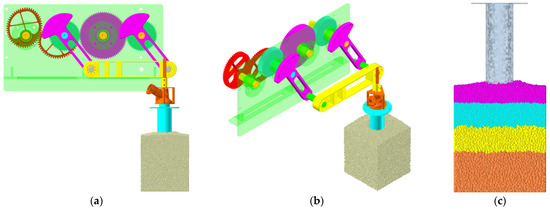 The bidirectional coupling of the discrete element method and multi-body dynamics could realize the interaction between complex mechanisms and discrete particles and has been widely used in the field of agricultural machinery [20,21]. The cavitating process of the cavitation under the action of the cavitating mechanism was the bidirectional interaction between the mechanism and the soil. Therefore, the method of the bidirectional coupling of DEM and MBD was used to analyze the cavitating process of the mechanism [22].