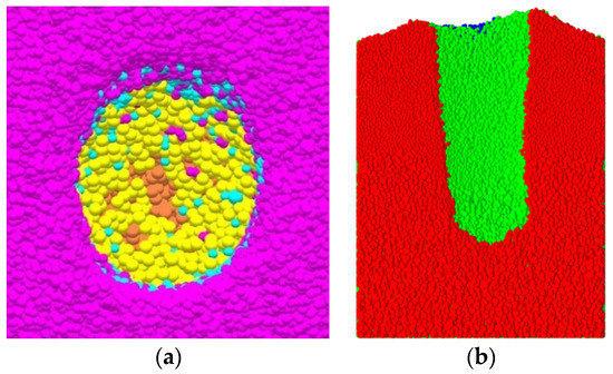 Figure 5a showed the process of the cavitator starting to interact with the soil until it reached the maximum depth of cavitation. As there was lack of the compaction and restriction of the other soil layers on the top soil layer, the gap between the soil particles was large, but the force between the soil particles was opposite. After the cavitator invaded the soil, the soil of the top layer near the cavitator rose, and the rotation of the cavitator would rotate and squeeze the soil particles, which made the soil particles generate the centrifugal force. Under the action of the centrifugal force, the soil particles on the top layer were thrown out and compacted to leave the cavitator, which resulted in a larger cavitating diameter for the soil of the top layer. With the increase in the cavitating depth, the force between the soil particles gradually increased, and the diameters of cavitation gradually decreased until it was the same as the diameter of the cavitator.