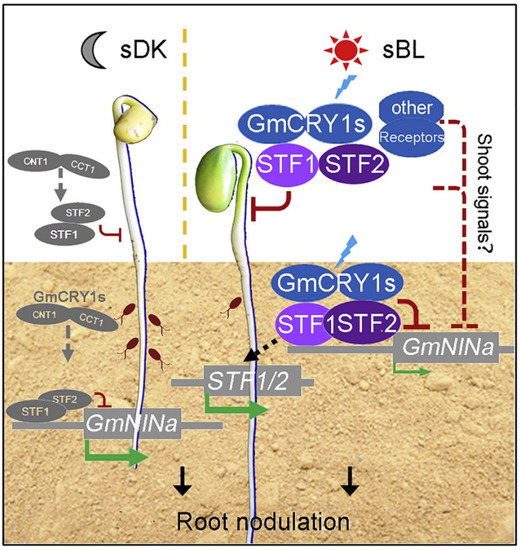 Solar radiation is a crucial environmental factor that determines the success of soybean. The response of plants of this species to the length of daylight exposure influences reproductive processes such as flowering initiation, flowering, fruiting and seed filling, determining the timing of the start and end of each of these developmental phases, as well as these rates of change within the plant [37]. Plants use light signals to determine the timing of key developmental transitions; blue light primarily triggers photosynthesis, which converts light energy into chemical energy stored as carbohydrates. In germinating seedlings, light activates photomorphogenesis, triggering the transition from heterotrophic to autotrophic growth [38,39,40]. Light inhibits hypocotyl growth, promotes cotyledon opening and activates the expression of light-regulated genes [41]. Plants use multiple photosensory receptors so they can detect a very broad spectrum of light, from UV-B to far red (280–750 nm). With these receptors, they can assess light quality, intensity and duration. The sensory photoreceptors involved in perceiving differences between full light and shade light, including red and far-red light-absorbing phytochromes (phyA and phyB), blue/ultraviolet UV-A light-absorbing cryptochromes (CRY1 and CRY2) and UV-B sensing photoreceptor (UVR8) [38,39,42,43]. Canopy light signals perceived by photosensory receptors modulate the extent of these responses [38]. Cotyledons/hypocotyls’ exposure to light has a significant effect on the initiation of Rhizobium infection and the development of nodules on the primary root of soybean seedlings. The effect of light is a substantial inhibition of nodulation on the primary root. This inhibition is seen if the cotyledons/hypocotyls are first exposed to light prior to inoculation, while exposure of soybean cotyledons/hypocotyls to light after inoculation can considerably augment nodulation [44]. It was found that the amount of light is crucial for nodulation. In the dark inoculated legume plants develop significantly fewer nodules [44,45]. It was established that short-term darkness benefits nodulation and blue light hinders nodulation by two soybean TGACG-motif-binding factors (STF1 and STF2), which are Papilionoideae-specific transcription factors and divergent orthologs of Arabidopsis ELONGATED HYPOCOTYL 5 (HY5) [40], a bZIP transcription factor that regulates growth in response to light [41,46], which acts as a mobile signal to coordinate shoot and root growth in response to light [47,48]. Furthermore, light signals also promote soybean symbiotic root nodules formation. The blue light receptor GmCRY1s-STF1/2 module holds a key role in integrating darkness/blue light and nodulation signals, as seen in Figure 1 by Ji et al. [40]. The light-induced soybean TGACG-motif binding factor 3/4 (GmSTF3/4) and FLOWERING LOCUS T (GmFTs), which move from shoots to roots, interdependently encourage nodule organogenesis. Light-activated root growth as well as N uptake are mediated by HY5 translocated from shoot to root [45,47].