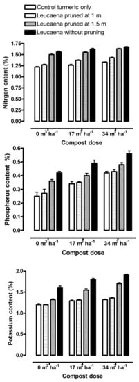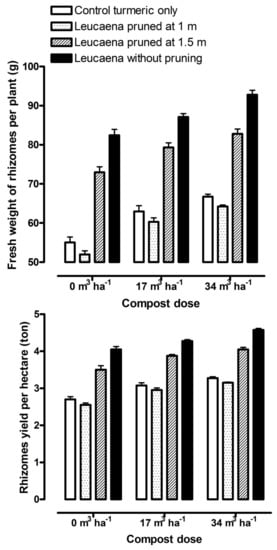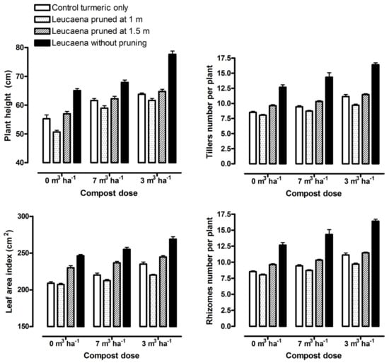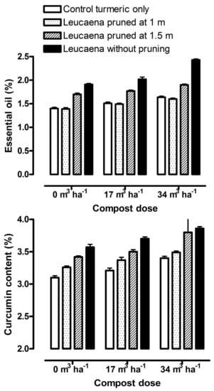 All in all, the highest values of vegetative growth and yield parameters as well as chemical, essential oil and curcumin content were found in turmeric plants alleyed between leucaena trees with no pruning and treated with compost at a dose of 34 m3 ha−1. The lowest values of vegetative growth and yield parameters were seen in turmeric plants alleyed between leucaena trees pruned at 1 m and the lowest chemical, essential oil and curcumin content was found when turmeric was grown as a sole crop (control).
