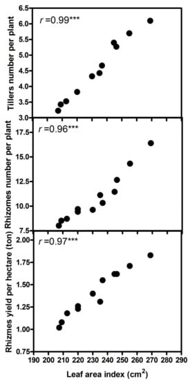 Coefficient correlation of leaf-area index and tiller number per plant, rhizome number per plant and rhizome yield per hectare. *** Significance at probability level of < 0.0001.