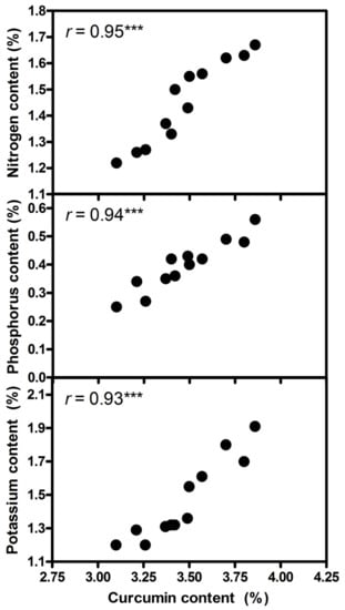 Coefficient correlation of curcumin content and nitrogen, phosphorus and potassium contents. *** Significance at probability level of < 0.0001.