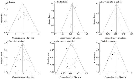 Our results show that gender, health status, risk attitude, family size, farm size, environmental concern, environmental cognition, social norms, cadre status, policy propaganda, and government subsidies significantly affect FEFB. Notably, publication bias was found in six variables, including gender, health status, environmental cognition, technical training, government subsidies, and technical guidance; these were corrected with Trim and Fill’s non-parametric methods (see Table 3 and Figure 1).