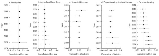 The factor of family size could significantly promote the FEFB, with the effect being relatively stable (see Figure 3). The agricultural labor force has a stable but non-significant effect on FEFB. This may be caused by the fact that most young and middle-aged rural laborers go out for work and the number of families staying in villages for farming is generally small [45]. Household income has no significant effect on FEFB, but gradually exhibits a positive and significant trend with time. This variable may be one of the important factors in promoting FEFB in the future and highlights the importance of promoting farmers’ income. The proportion of agricultural income had no significant effect on FEFB but gradually shows a positive and significant trend. As farmers’ incomes improve, the proportion of agricultural income is likely to decrease. In addition, part-time farming had a significant positive impact on FEFB before 2014; however, its impact declined, becoming negligible over time. This is consistent with China’s economic development practice. In the early stages of development, rural China had an inward-oriented development model. Specifically, farmers made up for the shortage of agricultural income through non-agricultural income and increased agricultural input objectively [46]; this was a livelihood mode of external supplement to internal income. However, with urbanization and economic development, this agricultural development mode has an outward focus [47]. Specifically, farmers have relied on both agricultural and non-agricultural incomes to buy houses in cities and towns to meet their livelihood strategies of urbanization. Therefore, while part-time farming may have promoted FEFB in the early stage, its influence has gradually weakened in recent years.
