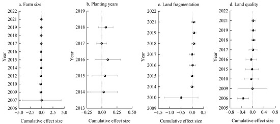The negative impact of farm size on FEFB remained stable (significant at a 90% confidence interval, see Figure 4). Contrary to farm systems in western developed countries, the agricultural industry in China is dominated by smallholder farm management and non-mechanized production operations. The expansion of farm size significantly increases labor input, which decreases the possibility of adopting FEFB [48]. However, our results also show that planting years, land fragmentation, and land quality had no significant effect on FEFB, and overall, their influence was relatively stable over time.