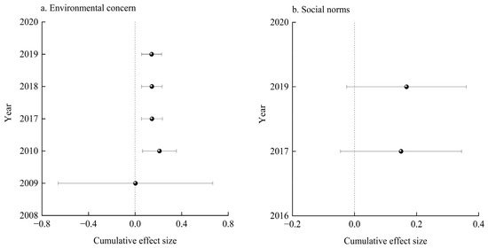 Cumulative meta-analysis is used to investigate how the trend of the effect size of these influencing factors (hereafter, influence trend) changes over time. Cumulative meta-analysis involves arranging the collected data in chronological order, integrating the effect size in turn, and analyzing the changes in the influence trend of a certain factor on FEFB over time. Considering the difference between the acquisition time of data and the publication times of different studies, we used the sampling year in each study as the time record.