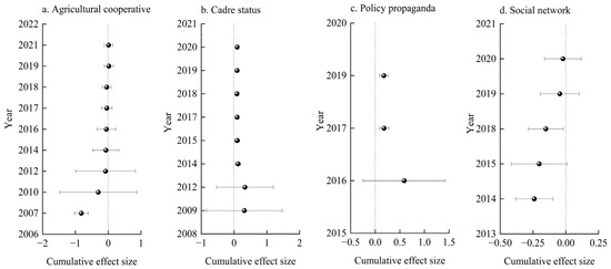 In this category, the decision to join cooperatives has no significant effect on FEFB and the trend is relatively stable. This indicates that the government should further standardize the operation of agricultural cooperatives to a certain extent [49]. Notably, the promotion effect of cadre status on FEFB became significant and relatively stable since 2014 (see Figure 6b). This may be because China launched a poverty alleviation program at the end of 2013. Consequently, village cadres across the vast rural areas of China were being professionalized, administrated, and regularized [50]. This may have restrained the unreasonable fertilization behavior of farmers with cadre status. Moreover, it may have also strengthened the regularization management in rural areas and even included village cadres in the official civil service team; this should be more conducive to FEFB. Moreover, policy propaganda has also shown the trend of a significant positive and stable effect on FEFB over time. Interestingly, the influence of social networks on FEFB gradually changed from a significantly negative to a non-significant level. In line with this trend, it may change to a significantly positive level in the future; this may indicate that communication and connections between farmers, and their relatives and neighbors are conducive to the diffusion of environment-friendly fertilization knowledge and technology [51]. This result may imply that using social networking in rural areas to promote FEFB could increase policy effectiveness.