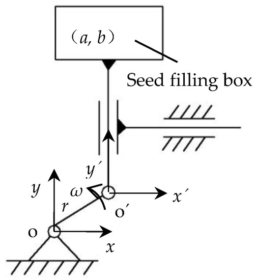 The motion of the seed-filling box can be simplified, as shown in Figure 4. The dynamic part is simplified as crank oo’, and the seed-filling box can be regarded as a rigid body. The track shape of all the position points on it is the same, and all points have the same velocity and acceleration at the same moment. oxy is the reference coordinate system; o’x´y´ is the connected coordinate system; ω is the angular velocity of the motor, rad/s; r is the eccentricity between the hinge center of the motor and the hinge center of the connecting plate on the eccentric disc (referred to as the disc eccentricity), mm. The position of any point on the seed filling box can be determined by its invariant vector in the connected coordinate system. It is supposed that the coordinates of the seed filling box in the connected coordinate system are (a, b) at some point.