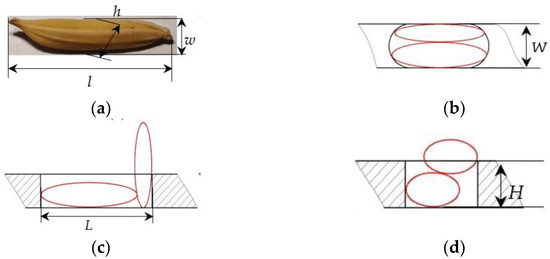 The top of the filling box is open, and there are square array holes on the bottom plate. The parameters of the shaped hole directly affect the seed-filling performance. Taking Wanxiangyou 111 as the research object, the seed shape is similar to the spindle, and there may be three states of falling into the mold hole: lying flat, lying on the side, and upright. According to the probability method, the probability of lying flat and lying on the side is much greater than that of standing up. At the same time, lying flat is the most possible stable state of hybrid rice seeds due to the principle of minimum potential energy. In order to contain only one seed in the mold hole, considering its shape, average size, and processing difficulty, the shaped hole is designed as a rounded rectangle. The schematic diagram of the three-circumference size of the seed and the limit size of the shape is shown in Figure 5.