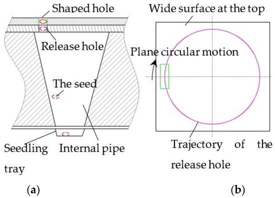 The principal diagram is shown in Figure 8. The seed guiding device is made of PVC material. The inner channel is wide at the top and narrows at the bottom. The upper part corresponds to the shaped hole, and the lower part corresponds to the seedling tray. During the operation, the upper part needs to accommodate the movement track of the hole so that the seeds always fall into the internal pipe. At the same time, the arrangement of the shaped hole should refer to the size distribution of the upper part so as to ensure the one-to-one correspondence between the shaped hole and the internal pipe.