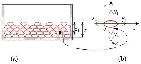 where: γ is the specific gravity, kg/m3; Ω1 is the surface area of the studied seed layer, m2; μ1 is the sliding friction coefficient between the seeds and the bottom of the seed-filling box; μ2 is the sliding friction coefficient between the seeds; F1 is the friction between the seeds and the bottom of the seed-filling box, N; F2 is the friction between the upper and the lower layer seeds, N; N1 is the supporting force of the bottom, N; N2 is the vertical pressure of the upper layer seeds on the bottom layer seeds, N; mg is the gravity of the seed, N; z is the total height of the seed layer, m; and z1 is the height of the upper layer, m.