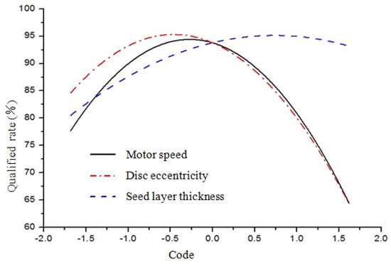 The results show that the relationship between the three factors and the qualified rate is a concave curve, which has a positive effect before the extreme value point and a negative effect after the extreme value point. The extreme value of the motor speed is −0.27 (actual value 197 r/min), the extreme value point of disc eccentricity is −0.46 (actual value is 19.5 mm), and the extreme value point of the seed layer thickness is 0.73 (actual value is 22.3 mm). The slope of the curve corresponding to the motor speed and disc eccentricity is higher, which indicates that the change in this factor has a greater disturbance on the qualified rate. The curve corresponding to the thickness of the seed layer is gentle, which indicates that the disturbance of this factor on the qualified rate was relatively small.