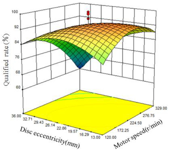 The influence of the interaction between motor speed and disc eccentricity on the qualification rate is shown in Figure 14. When the motor speed is low, the qualified rate increases first and then decreases with the increase in the disc eccentricity, but the range of variation is small. When the motor speed is high, the qualified rate decreases sharply with the increase in disc eccentricity.