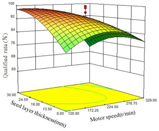 Figure 15 shows the effect of the interaction between the motor speed and seed layer thickness on the qualification rate. When the motor speed is low, the qualified rate increases with the increase in the seed layer thickness because the increase in the seed layer thickness at a low speed increases the positive pressure of the seed in the bottom layer of the seed-filling box, which increases the probability of the seed filling into the hole. When the motor speed is high, the qualified rate first increases and then decreases with the increase in the seed layer thickness, and the change range is small. The change in the seed layer thickness is relatively low, and the influence of the low-speed area on the qualified rate is not obvious.