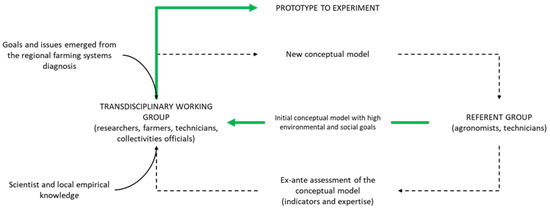 - Step 3: Designing the prototype of AEMF. This step corresponds to the “de novo” co-design of the prototype of AEMF based on agroecological (AE) principles/practices and opportunities for a circular bioeconomy at the regional scale. Co-design proceeded during interdisciplinary workshops involving agronomists, economists, ecologists, technicians, farmers, and decision-makers (Figure 1). A referent group proposed an initial conceptual model that was discussed and modified by a larger transdisciplinary working group; then, the new conceptual model was ex-ante assessed with the set of indicators built during step 2 and with data based on the literature and professional expertise. The results of the assessment were used to feed the next transdisciplinary working group until the prototype was validated for experimentation.
