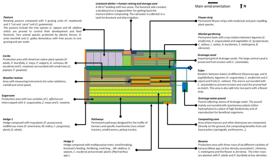Figure 2 presented an overview of the structure of the AEMF as defined during the co-design process and implemented as a first prototype in the experimental field of the research institute. The prototype was designed with six different activities (Sugarcane, Banana, Tuber, Caribs, Pasture, and Market gardening), presenting a high level of diversity. The main productions of each activity corresponded to crops currently produced by the farmers of the study region (i.e., sugarcane, banana, yam, pineapple, tomato), while local breed sheep husbandry (also found in the region) was the choice to replace cows in this small-scaled production system with regard to its food regime and disease resistance.