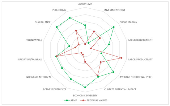 Synthetic view of the relative scores of the indicators for both the AEMF and the average regional farming system. Note: After mean-centering the scores, we multiplied the values of indicators that should have decreased (Investment cost, Climate potential impact, Active ingredients, Inorganic nitrogen, Irrigation/rainfall, GHG Balance, and Ploughing) by −1 in order to have the same reading. Higher values correspond to better performances.