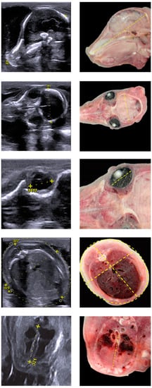 Ultrasound technology has been used in reproductive medicine in farm animals for thirty years and is mainly used for the early and safe detection of pregnancy, the detection of twin pregnancies in horses and the determination of fetal sex in horses and cattle [6,7,8]. In pigs, pregnancy is usually detected by nonimaging Doppler ultrasound techniques, and reports of the use of B-mode imaging during pregnancy in pigs are rare [8]. However, sonographically assisted fetometry offers the possibility of continuous and minimally invasive monitoring of fetal development throughout pregnancy [9,10].