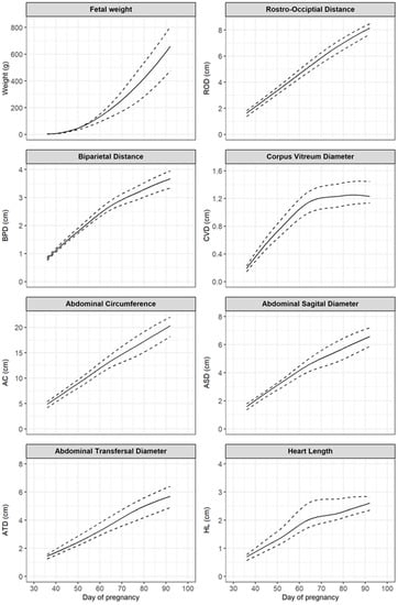 Conversely, the different growth curves of Figure 1 can also be used to estimate the stage of pregnancy when the mating date is unknown. In pigs, the gestation age is usually known due to targeted mating. However, estimating the stage of pregnancy could be of importance for free-range farms with a boar, or hobby farms. In human medicine, however, the determination of gestational age by the use of fetometry is an important part of gynaecological examination [1,14], and also has some significance for other animals [3,4,5,21].