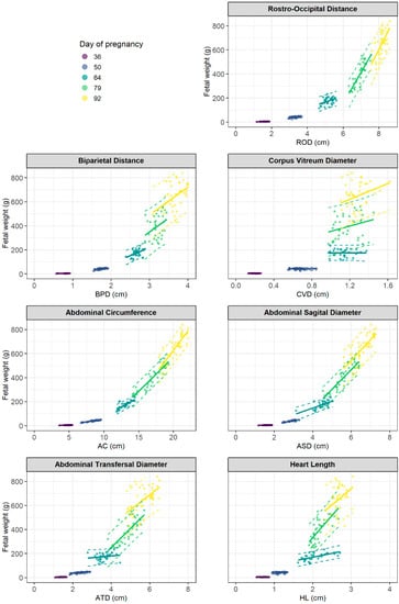 Relationships between examined morphological parameters and fetal weight. Shown are the individual measurements (dots) and the different colours indicate the five investigated time points of pregnancy (36, 50, 64, 79 and 92 days of pregnancy). Separate linear regression models were fitted at each day of pregnancy. Fitted linear regression lines (solid lines) and 95% prediction bands (dashed lines) are shown. Estimated parameters of the linear regression model are given in Table 1.
