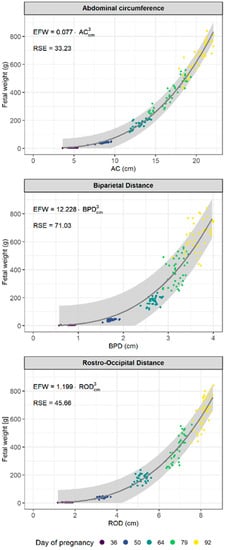 Statistical data analyses were conducted using R statistical software v. 4.2.0 [18] and specifically for data processing and visualization with the “tidyverse” package [19]. Temporal developments of all morphometric parameters over the course of pregnancy are shown as smooth curves of the medians, the lower 5% and the upper 95% percentiles. Smooth curves were fitted using Loess, a non-parametric local Regression approach. To inspect the linear relationship between fetus weight and all measured morphometric parameters (BPD, CVD, ROD, AC, ASD, ATD, HL), separate linear regression models were fitted for each parameter at each of the five investigated times points of pregnancy. R-square (R2) is used as the indicator of the goodness of fit of the models. As a next step, effects of all measured morphometric parameters, including day of pregnancy, on fetus weight were estimated fitting a linear mixed model using the lmer function of the package “lme4” [20]. The nested structure in the data, i.e., 10–17 fetus per sow, was properly defined and all variables were treated as fixed, continuous predictors. We log-transformed fetus weight to approximate normal distributions. Likelihood ratio tests were performed to test for the fixed effects. Based on these results, the three most important morphometric parameters were identified (AC, BPD, ROD) and multiple linear regressions were fitted to predict fetus weight, again separately at each of the five investigated time points of pregnancy. Adjusted R-square (R2), i.e., adjusted for the number of predictors and the associated changes in degrees of freedom, was used as the indicator of the goodness of fit of the multiple regression models. Finally, nonlinear, least squares regression models were fitted separately for the three most important morphometric parameters (AC, BPD, ROD) to predict fetal weight. A cubic function was chosen (). As goodness of the fit of a nonlinear regression model cannot be assessed using R-square. We therefore present the residual standard error (RSE). The smaller the values, the better the model fits the dataset. In addition, prediction bands of the fitted lines were calculated and visualized.