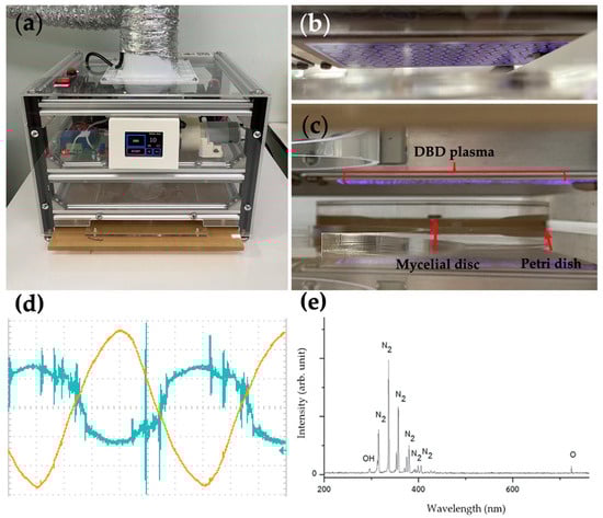 The DBD plasma device and its use in the fungal inhibition experiment: (a) DBD plasma device setup; (b) DBD plasma-generating discharge plate; (c) DBD plasma exposure on a fungal cultured Petri dish; (d) V (orange)–I (green) air discharge waveform; (e) typical OES of the DBD plasma.