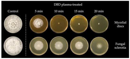 The mycelial discs and sclerotia of A. rolfsii were treated with DBD plasma by exposure at 1.5–2.0 cm distance for 5, 10, 15, and 20 min on PDA plates with three biological replicates (Figure 1c). The plates were incubated at room temperature (25–28 °C) for 2 weeks. The radial growth of DBD-treated mycelial discs and sclerotia was compared with a non-treated control, which was calculated using the formula of Philippe et al. [34].