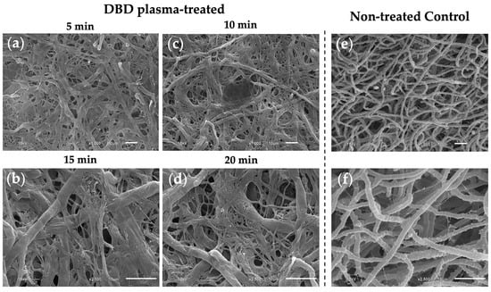 Scanning electron micrographs of Athelia rolfsii mycelia (a–d) after exposure to DBD plasma for 5, 10, 15, and 20 min compared with the non-treated control (e,f). Mycelia treated with the DBD plasma showed characteristics of laceration, whereas mycelia from a non-treated control showed normal characteristics.