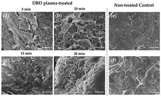 Scanning electron micrographs of sclerotia of Athelia rolfsii (a–d) after exposure to DBD plasma for 5, 10, 15, and 20 min compared with the non-treated control (e,f). Sclerotia exposed to DBD plasma showed lacerated and sunken surfaces, whereas sclerotia from the non-treated control showed regular surfaces.